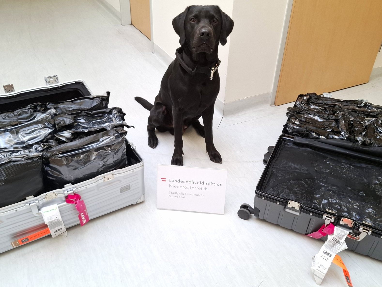 Diensthund "Jerry" fiel am Dienstag bei Kontrollen am Flughafen Wien in Schwechat durch sein Interesse an zwei Koffern auf.