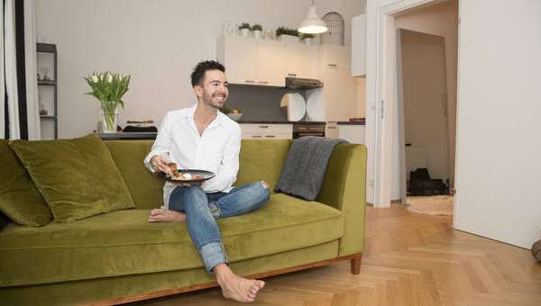 Ein Vogelkäfig über dem Kühlschrank. Ein runder Spiegel hinter der Herdplatte. Bunte Pölster auf schwarzen Sesseln. Mittendrin steht Mio Paternos und