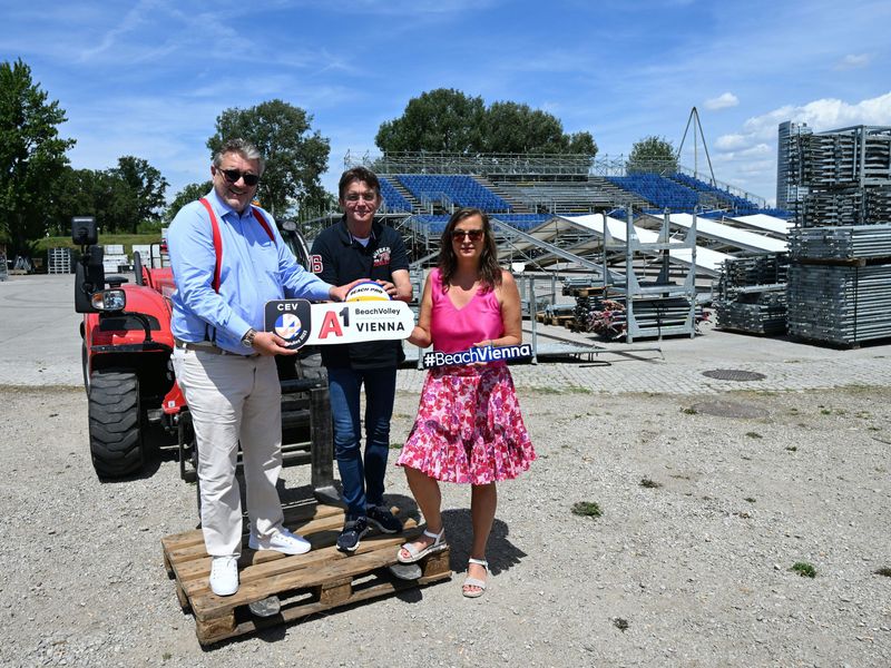 Von 2. bis 6. August steigt auf der Wiener Donauinsel die Beach-Volleyball-EM. Am Freitag wurde mit den Aufbauarbeiten begonnen.