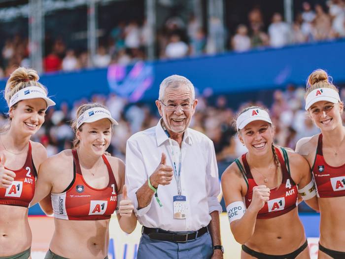 Österreichs Beach-Volleyballerinnen Katharina Schützenhöfer/Lena Plesiutschnig und Dorina Klinger/Ronja Klinger erreichten beim Nations Cup in Wien