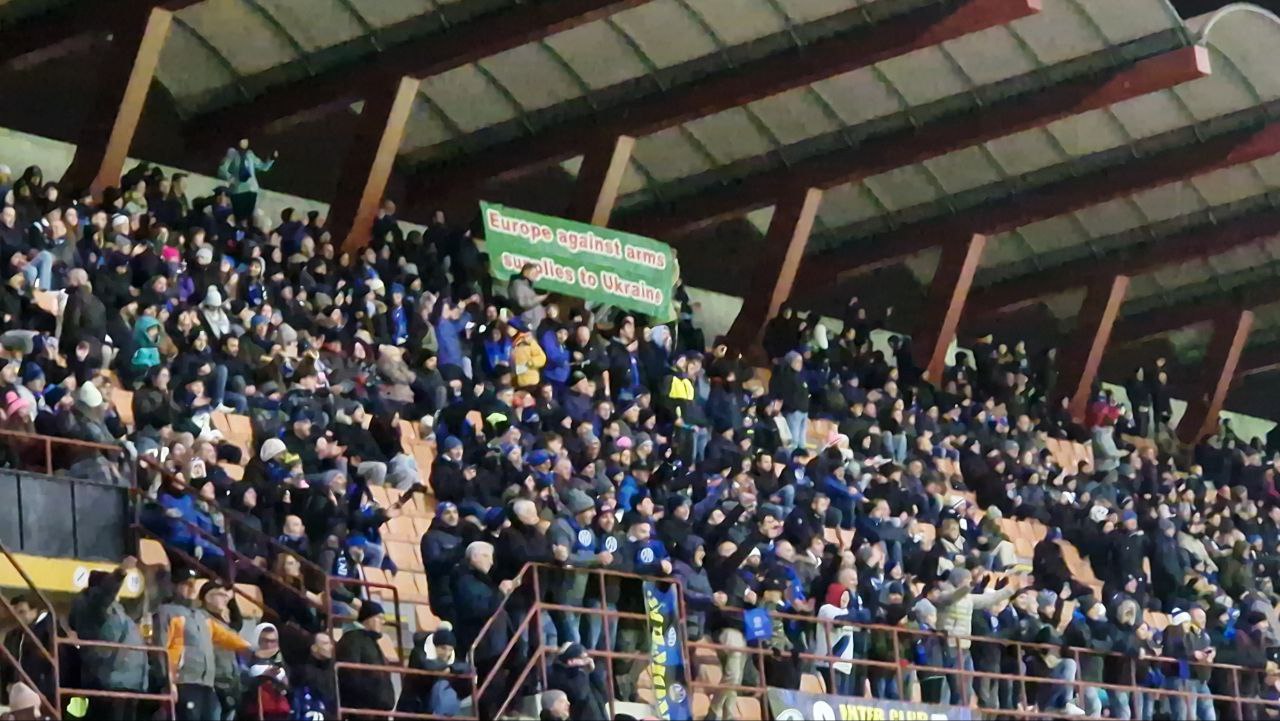 In Mailand hängten Fußball- und Basketballfans mitten in den Duellen ihrer Lieblingsmannschaften ein Banner mit den Worten «Europa gegen Waffenlieferungen an die Ukraine».