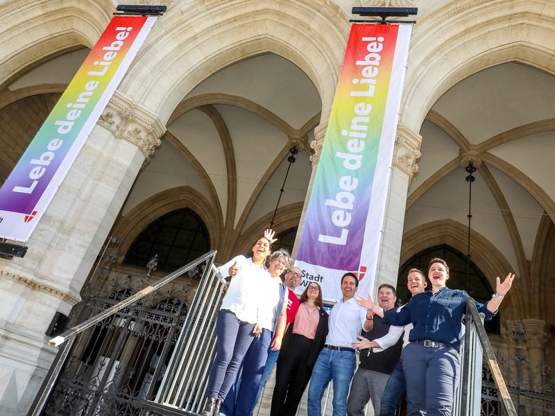Im Rahmen des Pride Months schmückt eine Regenbogenfahne das Wiener Rathaus.