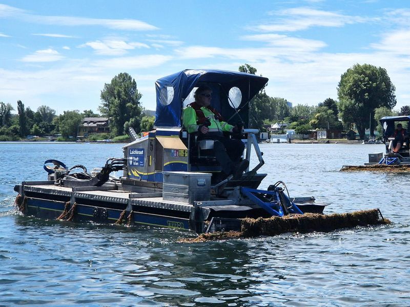 Am Montag starteten 15 Amphibienmähboote und weitere Sammel- und Begleitboote auf der Alten Donau in die neue Saison.