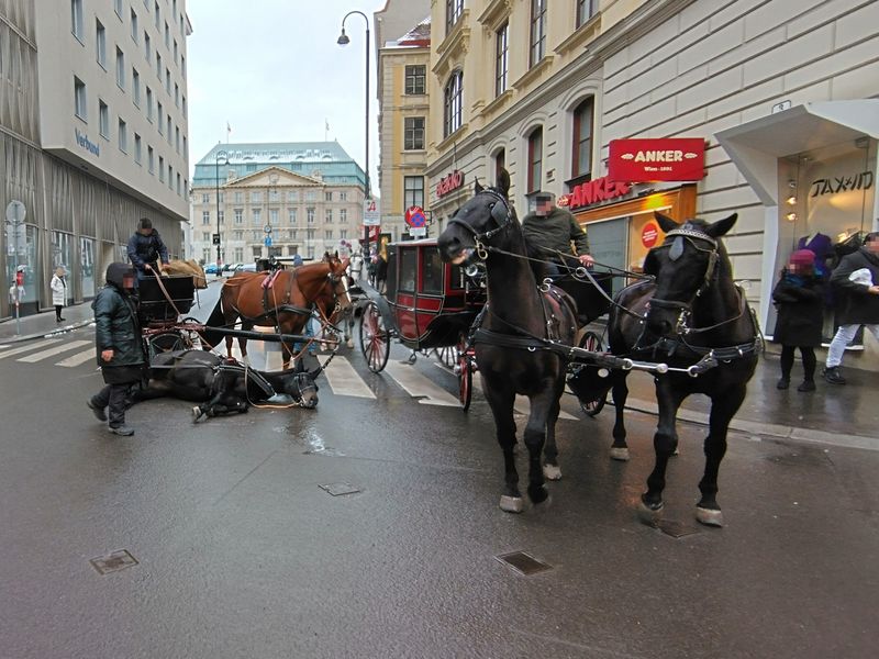 Am Samstag dürfte ein Fiaker-Pferd in der Wiener Innenstadt auf glattem Asphalt ausgerutscht und deshalb gestürzt sein. Ein Augenzeuge verständigte