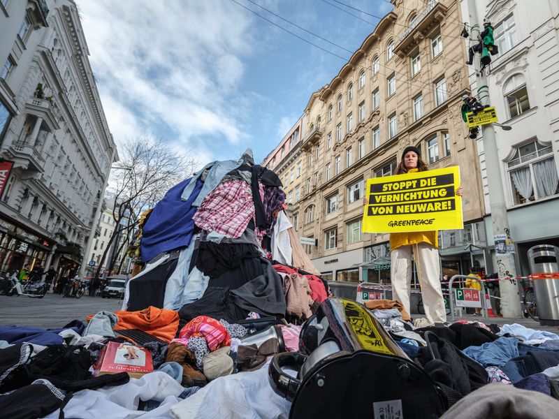 Mit einem Müllberg samt XXL-Shirt prangerten Greenpeace-Aktivisten am Mittwoch die exzessive Überproduktion und kurzen Lebenszyklen von Kleidung,