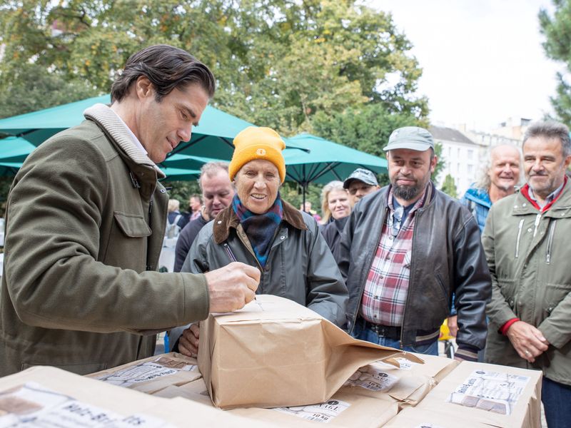 Der Bundesprädidentschaftswahl-Kandidat Tassilo Wallentin hat am Sonntag im Werben um Stimmen Brennholz in Wien verteilt.