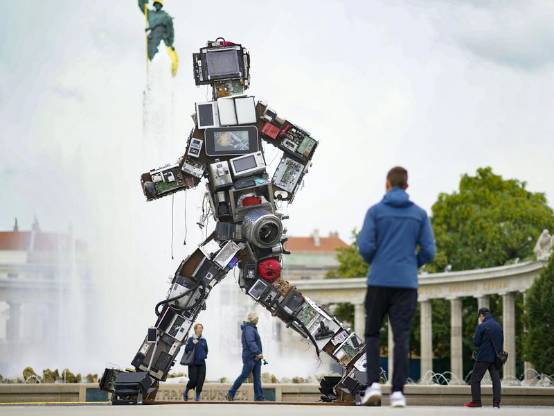 Er ist sehcs Meter hoch und spaziert seit Dienstag am Wiener Schwarzenbergplatz vor dem sowjetischen Heldendenkmal: Ein Schrottriese soll als Mahnmal