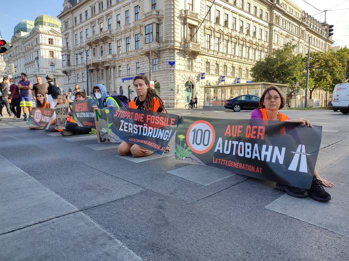 Klimaaktivisten haben am Dienstag um 8.30 Uhr herum auf dem Ring nahe der Station Schottentor in Wien den Verkehr blockiert. Mehrere Personen haben