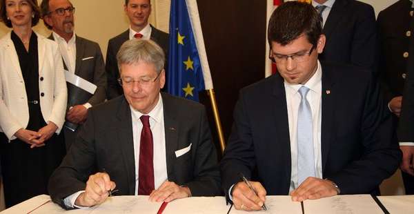 Der Kärntner Landeshautmann Peter Kaiser (SPÖ) und der künftige Landesrat und ÖVP-Chef Martin Gruber haben am Mittwoch die Koalitionsvereinbarung zur