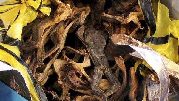 Mit mehr als einem Kilogramm getrockneten Fröschen ist ein Mann von Nigeria nach München gereist. Zöllner am Münchner Flughafen entdeckten die Fracht