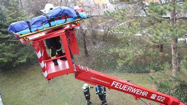 Eine verletzte Seniorin ist Freitagvormittag in Maria Enzersdorf, Bezirk Mödling, von der Feuerwehr durch das Fenster aus ihrer Wohnung im zweiten