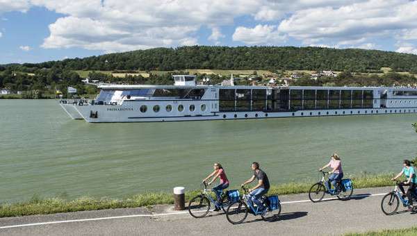 Ybbs Anlegestelle. Auf dem Pier vor der MS Primadonna stehen sie schon aufgereiht – die hellblauen Fahrräder der Donau Touristik mit den