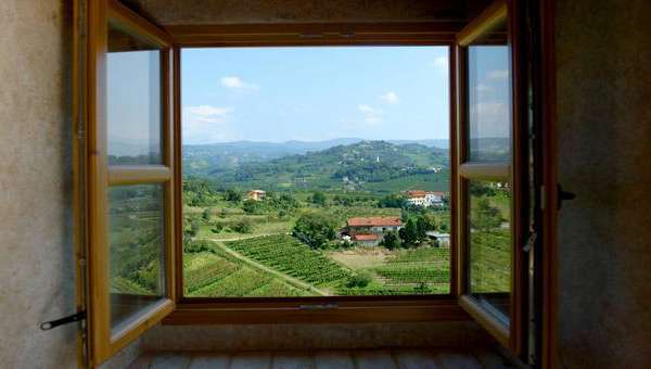 Was für ein Ausblick! Sattes Grün, sanfte Hügel und Weinberge erfreuen das Auge, wenn man von der Terrasse der Domačija Čebron im Wippachtal blickt.