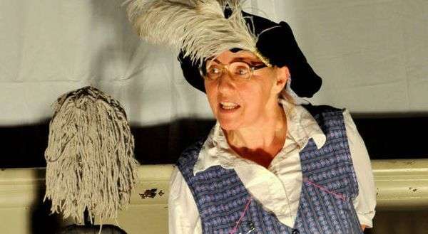 Mit karierter Kleiderschürze, Kopftuch und Wischmopp wuselt die kleine Frau schon vor der Vorstellung zwischen den wartenden Theatergästen herum. Mit
