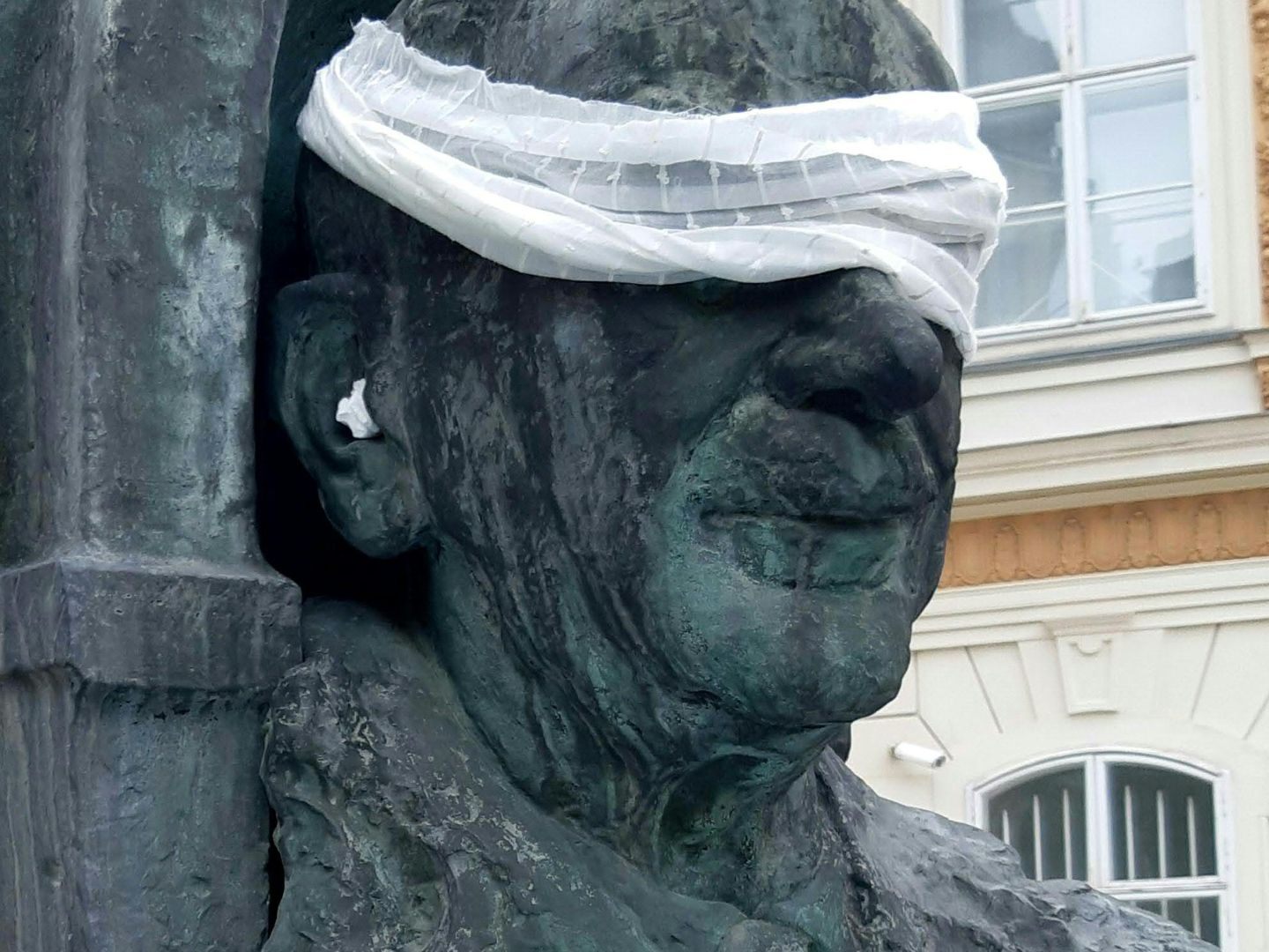 Das Denkmal von Leopold Figl in der Wiener Innenstadt hat eine Augenbinde und Ohrstöpsel erhalten.